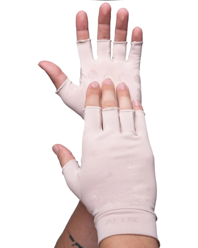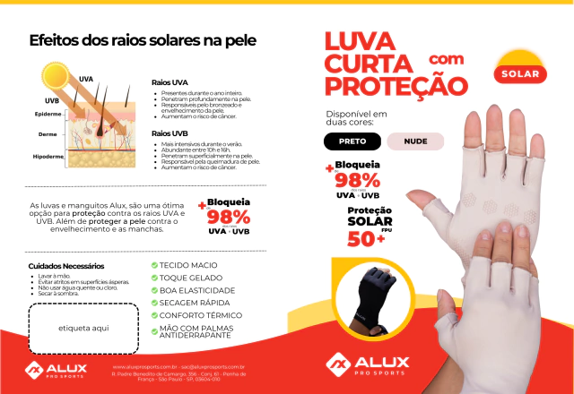 Par de Luvas com proteção solar para quem busca proteção para as mãos. Ideal para uso diário ou pós-tratamentos dermatológicos, para prevenção de manchas e envelhecimento da pele. Pode ser usada também na água. Com a palma da mão em silicone, proporciona ação antiderrapante. Sugerimos uso também para quem dirige o dia todo e fica exposto aos raios solares. Benefícios; Proteção da pele diária, não escorrega, tecido com toque agradável, macio e confortável; Seca rapidamente e não causa mau-cheiro. Costura confortável que não machuca a pele. O silk antiderrapante das mãos garante segurança e firmeza ao dirigir ou manusear algum instrumento esportivo.